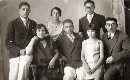 This is my mother's family. From left to right sitting: my grandmother Roche-Leya Meyertal, her youngest son Pesach Meyertal, my mother's younger sister Sheine, my grandfather Zalman Meyertal. Standing from left to right: my mother's eldest brother Isaac Meyertal, my mother Miriam-Debora Meyertal and her elder brother Hirsh Meyertal. The picture was taken in Tartu in 1928.