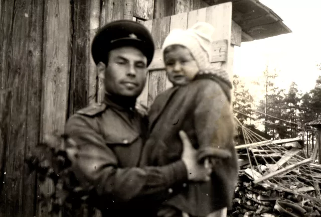 This is me with my daughter Diana, during the visit of my wife and daughter to Kamchatka. The picture was taken next to our barracks in 1952.