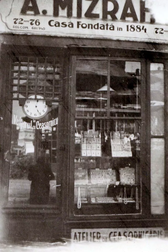This is the A. Mizrahy store, the clock workshop of my grandfather, Avram Mizrahy. The sign says that the workshop was founded in 1884, and the address was 72 Carol Street (former 76). The shop may have been small, but the sign was big, visible from a distance: 'A. Mizrahy - house founded in 1884'! In the glass of the showcase one can see the reflection of the buildings across the street, as well as the silhouette of the person who took the photograph, whose identity remains unknown, but who may have been a member of the family.