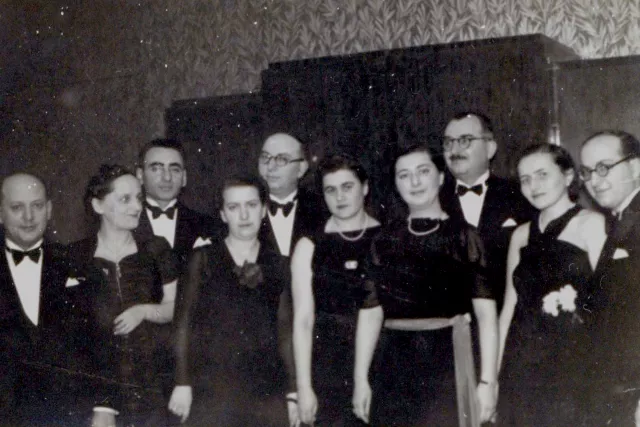 This photo was taken in Bucharest in 1938. This is a very important photograph for me; here are all the Mizrahy siblings together with their spouses. From right to left: Solomon [better known as Soly] Mizrahy and his wife, Odette Mizrahy, Iancu Rosman and his wife, Carola Rosman [nee Mizrahy], Henriette Mizrahy [nee Schonfeld] and her husband, Moscu Mizrahy, Suzette Aronescu [nee Mizrahy] together with her husband, Felix Aronescu, Paulina [nee Hurtig] and her husband, Leon Mizrachi.