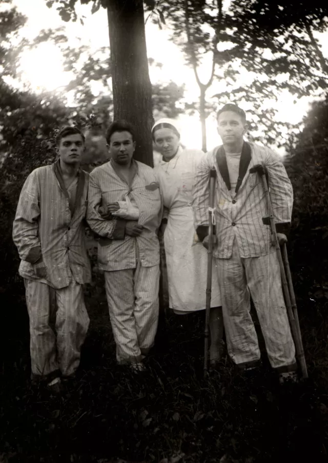 This is me, Moisey Marianovskiy, the 1st on the left, in a hospital in Moscow, after my 3rd wound on the 2nd Belarus Front. Unfortunately, I don't remember the others in this picture; they are patients of the hospital and a nurse.