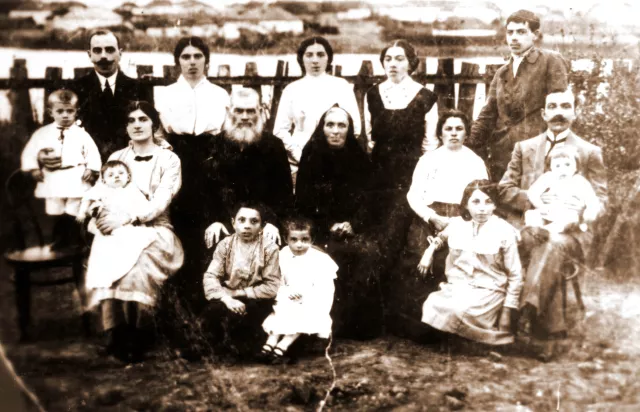 This is my family. It's a copy of the photograph taken in Novy Bug town in 1917 or 1918. Upper row (3) from left to right: My brother Shimon Marianovskiy, on my papa Efroim Marianovskiy's lap, Mama Clara Marianovskaya beside her is papa's sister Shpynia Marianovskaya, my older sister Emilia Marianovskaya, my brother Yakov Marianovskiy is on the right. 2nd row, sitting from left to right: papa's brother Noah Marianovski's wife holding their child (regretfully, I don't know their names), my grandfather Moisey Marianovskiy, my grandmother Bluma Marianovskaya, my sister Revekka Marianovskaya, my uncle Noah Marianovskiy holding his child whose name I don't know. Lower row: sitting on the ground are the children of my uncle Noah Marianovskiy. Regretfully, I don't know their names.
