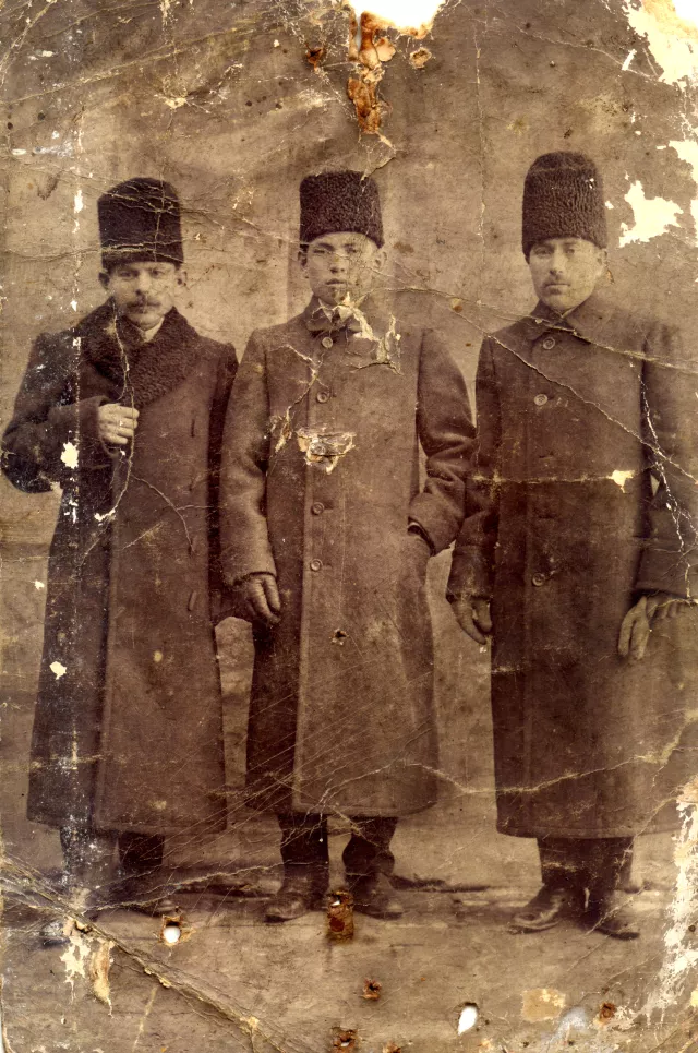 On the left is my father Moisey Muchnik, with him are his brothers Motl and Folyk Muchnik. This photo was taken in Bershad in a photo shop before WWI, in 1916; the brothers are wearing papaha overcoats made by my father.