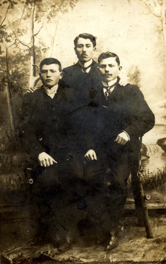 My father Moisey Muchnik is on the right, in the center is his brother Folyk, on the left is his brother Motl, This photo was taken in 1917 in Bershad, before my father brothers' departure abroad.