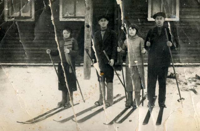 This photo was taken in front of the school of Pervomayskoye village. Standing second to the left is my friend, Maxim Mikhailovich Rosenburg. My other companions' names I don't remember.