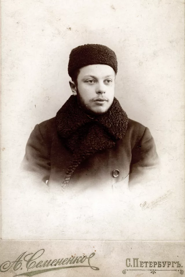 The photo was taken at the end of the 1890s in Saint-Petersburg; it is winter and he is dressed warmly in a coat with an astrakhan collar and a similar hat. His moustache and beard have just begun to grow.