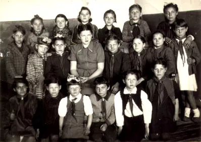 This is me with my schoolmates. The picture was taken in Kokand in 1943. I am third from the right in the top row.