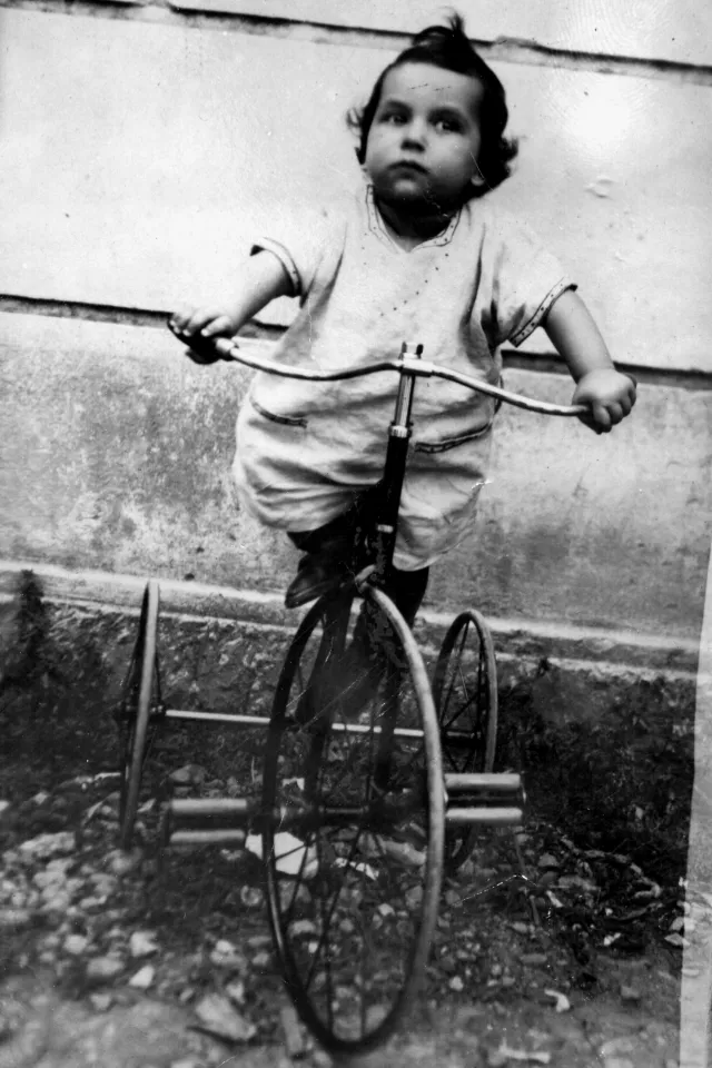 This is me probably less than three years old. I am sitting on a bike that we had for both my brother and me. It is a strange bicycle, it has three wheels. This picture was taken in our garden in the house on Gravias Street, the house of Cohen the dentist who was quite famous in Thessaloniki. He had two sons that I used to play with a lot when I was young.