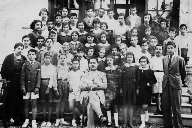 This picture was taken when I was in the fifth grade of the elementary school in the 'Zahariadis School,' which was a private establishment. The man in the middle is Mr. Zahariadis the principle, my brother is the boy in the suit on Zahariadis's right hand side, in the first row of people right at the end, I am sitting next to him. Right behind me in the second row, the boy who is smiling, is John Beza. Years later we left together and went to the mountain to join the National Popular Liberation Army. On the right side of the first row, the older man standing at the end is Mr. Pavlidis, the music teacher, who played the violin very well and the girl next to him is Lilika Giadikiaroglou, a friend of mine.