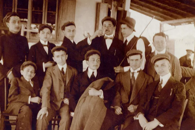 The photograph was taken in 1913 in Bucharest. The first on the right in the front row, is my father, Moscu Mizrahy, in his school uniform, together with his friends, celebrating the Purim holiday.