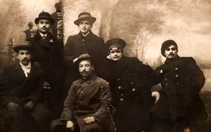 These are the musicians of the 5th squad of the 3rd regiment of the Emperor Alexander. The 2nd to the right is my father Moses Zelbert. The picture was made in Odessa in 1914. The last to the left is my father's friend Lev Gelzin.