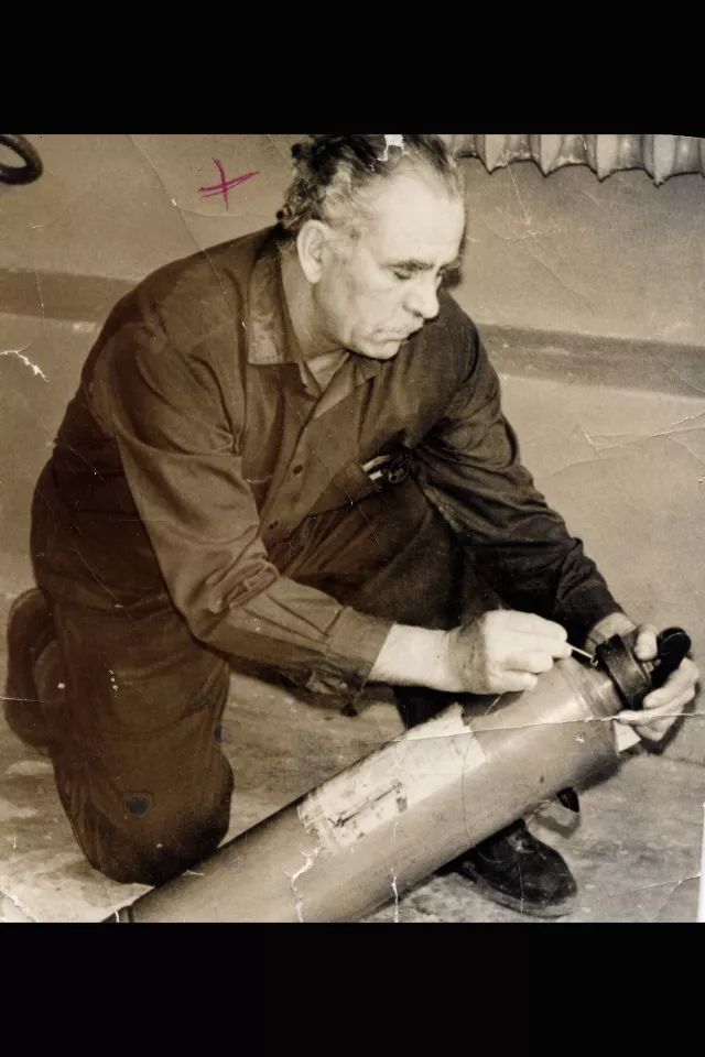 This is me. In 1959 I went to Kamensk Uralski, a mountain area. There at the factory 10,000 workers, worked 24 hours, three shifts of eight hours. I got a good position as a turner and I climbed the ladder to the point that a year later my portrait was hanging at the entrance as the best worker of the factory. As a turner I worked in the department of machine maintenance and repair in the factory which produced metals. This photo was taken when I was showing to the other factory workers a fire extinguisher and explaining to them how to use it.