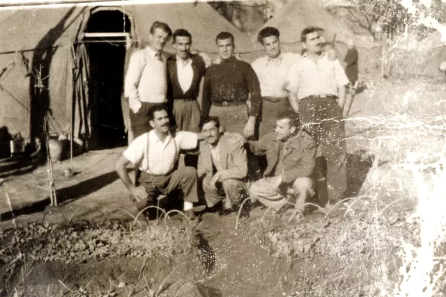 Here I am on Ai Stratis Island with other political exiles from Thessaloniki. This photograph was taken on New Year’s Day in front of our vegetable garden where we grew food. I sent this picture to my parents in Thessaloniki and that is why on the back is written ‘On New Year’s Day. In front of our vegetable garden. Your son Burla. 19 Sarantaporou Str., Esthir Burla.’