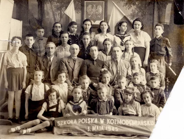 This picture was taken in a Polish school for mostly Jewish children in Koz'modem'yansk, USSR. All the children and teachers had been deported from Poland. I’m sitting in the middle, in a black dress. My daughter Halinka is standing in the top row, second from right. This picture was taken 3 May 1945.