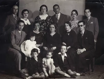 This is the family on my father's side - Merkado Mois Natan - first on the right on the middle row. After him from right to left are: my mother Rebeka Avram Natan (nee Geron), Sultana Natan (Merkado's mother), Matilda Natan and her husband Marko Natan (Merkado's brother) with their daughter Doroty. From right to left on the upper row are: David Mois Natan (Merkado's brother), the sister Belina Mois Natan, Aron Mois Natan (Merkado's brother) with his wife Erna, Sharlota (Albert's wife) and Albert Mois Natan (Merkado's brother). On the lower row from right to left are: my brother Mois Merkado Natan, Matilda (daughter of Aron and Erna) and I, Avram Merkado Natan. The picture was taken in Varna on 1st September 1935. There is a date on the back of the photo.
