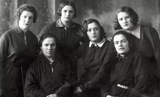 Women of our family: left to right: Fenia, wife of mamma's older brother Zalman Shub; Dvosia Shub, mamma's younger sister; my mother Basia Shub - the one on the right. Sitting from left to right: mamma's older sister Asia Shub; Raya Shub, middle brother Shelik's wife, stranger.