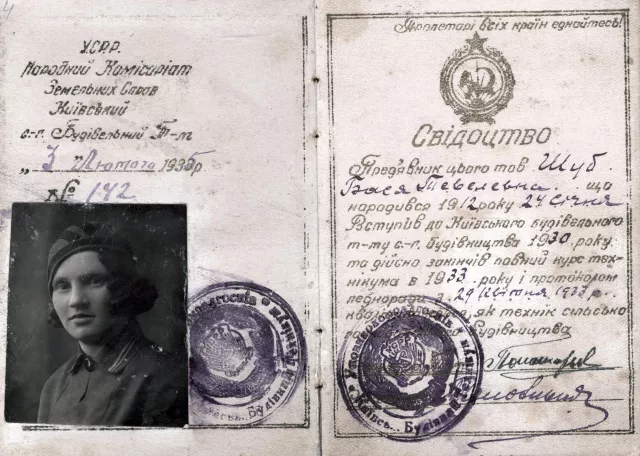 Construction school diploma with the picture of my mother Basia Shub. Issued on 3 February 1935. Photograph taken in 1935 in Kiev.