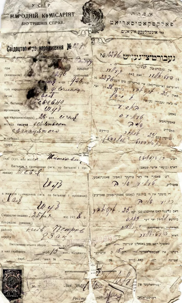 My mother's, Basia Tevievna Shub, Birth Certificate, issued in 1928, in Kiev, on the basis of the certificate confirming her birth in Zhytkovichi in 1912. The language of this Birth Certificate is Ukrainian and Yiddish.