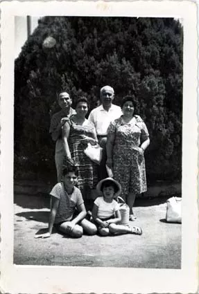 This is a photo of our very dear neighbors and friends Yair and Mari Mizrahi. You can see my husband Isak Franko standing at the back on the left, Yair Mizrahi is standing beside him on the right. I am standing in front of my husband and Mari Mizrahi is standing beside me on the right. In front of us, sitting down are my son Tovi on the left and my daughter Feride on the right.