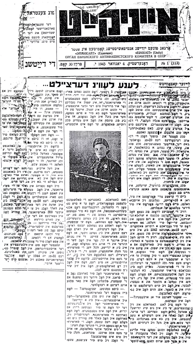This photograph shows a newspaper issued in Yiddish in 1945 in the USSR. There you can see my photograph: I wore uniform and held a gun, because I was a member of a partisan group.