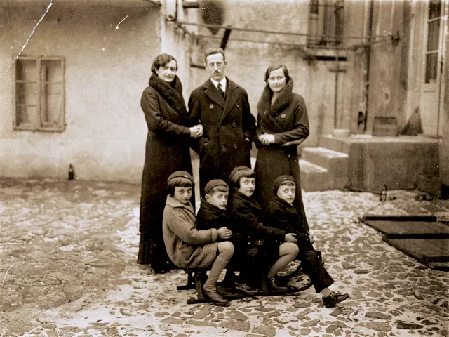 This is a photograph of my family in Belgrade. From the left is my mother, Miroslava; my father, Nikola; my mother's sister Persida; my cousin Dobrila; my brothers Ljubomir and Vojislav; and me.