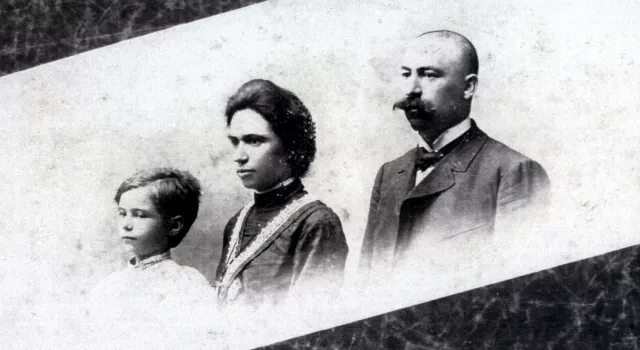 My grandfather on my father's side Ilia Shwartz, grandmother Bertha and their older daughter Rebekka. Photo made in Evpatoria in 1904 when the family moved to this town. Photo studio of Kotzenelenbogen.