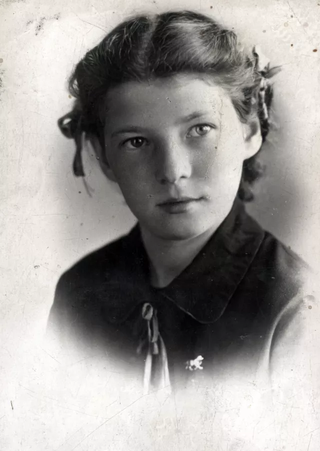 This is a photo of me, taken in 1943 when I was a schoolgirl. I went with my classmate to the photo studio in Lesnoy Prospekt, which still exists, and the photographer took a photo of her, too. I am in an old gown, which some neighbors or acquaintances gave me. At the time nobody had anything.