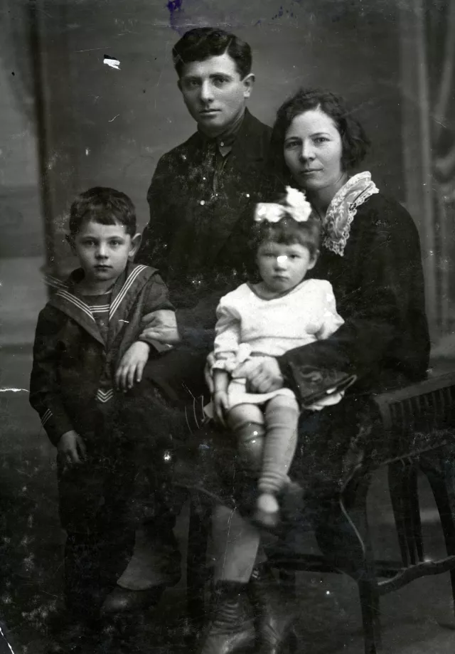 Next to us are my brother Volodya and my father Aron. Volodya was three years older than me. He died of tuberculosis at the age of 23. Mom took his death hard. Dad is about 28 years old on this picture, he earned good money.
