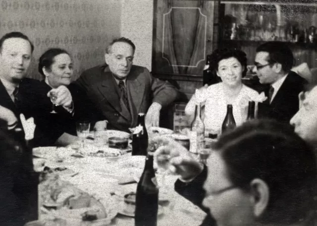 This photo was taken at my and Vladimir’s wedding celebration. His parents are sitting next to me: on my left Abram Lvovich (here he is past 60) and on his left - Bronislava Isaacovna (she is 58) . They were from Nikolaev, where my husband Vladimir Abramovich Kunin was born too. In the picture he is 34, I am 29. Now it could be called a late marriage, but at that time it was just normal. Many of my girlfriends had not married at all, because there were no men of a ‘normal age’ after the war in the country, for they had perished at front. To the left of Bronislava is her brother Samuel, who lost his arm at the fron. He lived a long life and died at the age of approximately 90 in Leningrad.