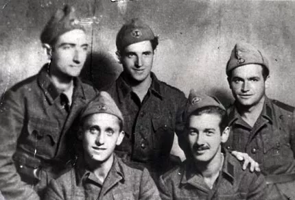 On 9th September [1944] a group of Jews from Sofia, including me, volunteered to join 3rd Guards Regiment in Dupnitsa. On the day before we left for the front in October 1944 we decided to take that photo. I am the first from left to right, followed by David Benvenisti, who later became editor-in-chief of the year-book of the Jewish organization and Haim Levi. Sitting down are Leon Beraha and Mois Leon. Only I and Mois Levi are still alive.