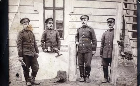 This is a photo of my father Mihael Kohen during his military service - they are doing repair work. My father is the second on the left with a wooden hammer in hand. The photo was taken in Sofia shortly before the [First] Balkan War in 1912.