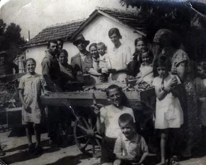 This is a photo taken in the Jewish neighborhood Iuchbunar. At that time people sold vegetables on two-wheeled carts and the vendor passed along the streets and offered them to the people. Some people have gathered around such a cart on the photo. In the background the man with the hat, who is fifth from left to right is my father Mihael Kohen. The others are neighbors from our street. The photo was taken in 1938 in Sofia.