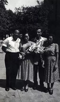 This is a photo from my wedding. My wife Lora-Sofia and I are in the middle. Beside us are our sponsors Albert, first on the left, and Rashel Beraha, first on the right. The photo was taken on 17th August 1952 on Odrin Str in Sofia. Albert Beraha worked for a long time as supplier in Sofia and for the Interior Ministry.