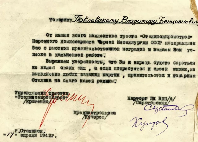 An official greeting to my father on the occasion of the award of the Order of Red Star for Labor to my father Vladimir Pavlovskiy, signed by Mr. Kratenko, director of Stalinskpromstroy trust, Mr. Saratovskih, Party leader of the Central Committee of All-Russian Communist Party of Bolsheviks, and Mr. Kucherov, Chairman of the Construction Committee, on 17 April 1943.