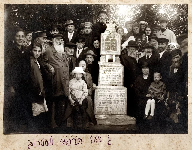 In the first row to the left of the monument sits the rabbi's wife Mina Ida with a baby in her arms. The photo was taken in Ostrov in 1924.