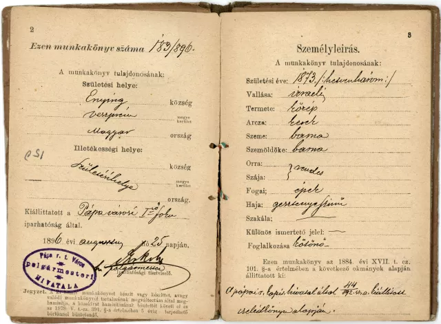 Before her marriage my grandmother had probably been a maid, too, because her employment card was issued by the Papa trade authorities on 25th August 1896, based on the maid's card, also issued in Papa in 1892. She needed the employment card because between 25th and 30th October 1896 she worked as a knitter's assistant at Samu Weis' in Vagujhely. Her salary was 8 forints a month and full board. According to her marriage certificate she worked as a stockings knitter.