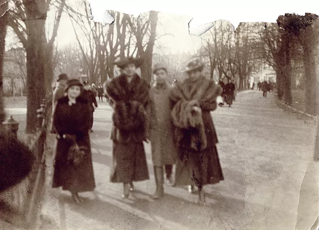 This is my mother, Paulina Keiner (nee Kleinberg), with her eldest sister Zofia Minder (nee Kleinberg) in the streets of Cracow. This must be already the end of the 1920s. On the photo from left: unknown person, Aunt Zofia, unknown person, Mother.