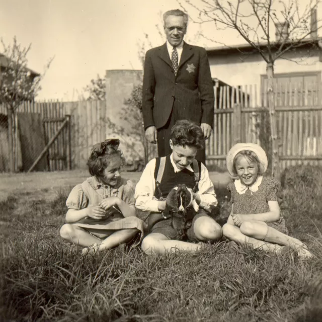 I'm sitting in the middle and am holding one of our rabbits, my sister Lenka is sitting beside me, on the right, and standing above us is my father (Karel Chaim Werner). An interesting thing is that he's already got a yellow star on his lapel. At that time he had already lost his job at the Kudrnac company, and he had to go do manual labor in Pardubice - he and the other Jews swept streets, cleaned sewers and streams.