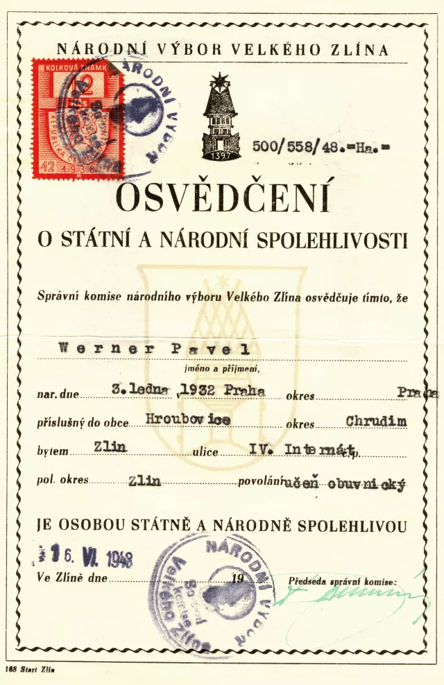In 1948 I obtained a Certificate of National Reliability, as was required in those days. During my shoemaking studies in Zlin I was active in the Youth Union, where there were various ensembles, I led the recital ensemble. Everything of course had a strong Communist foundation, there I entered the Communist Party at the age of sixteen. I was a bit apprehensive, as our teacher was a National Socialist, but he was a very kind person and in the end joined the Social Democrats.