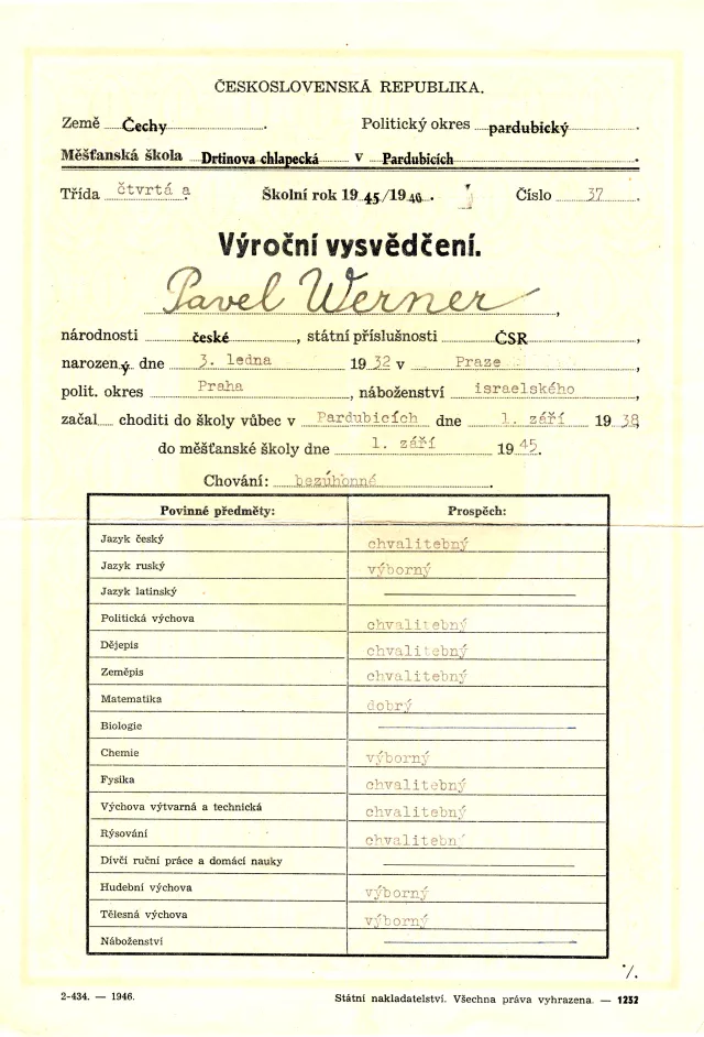 This is my first post-war report card, when after the pause during the war years I once again began attending school. I started going to school in Pardubice, the fourth grade of public school. I had to study hard to catch up to everything. I did practically nothing but study, I sat up until with my schoolbooks until late at night.