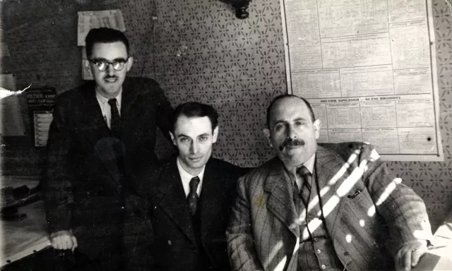 This photo was taken in our family office 'Adolf Sosberger Agency and Commission Store' in Karadziceva street. First from left is me, next to me is my cousin Kis Marcika and from right side is my father Joka.