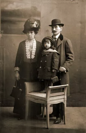 Lady (on the left), child (standing, on a chair), gentleman (on the right), this is aunt Peppi, my aunt, one of my father's sisters with her husband and child.