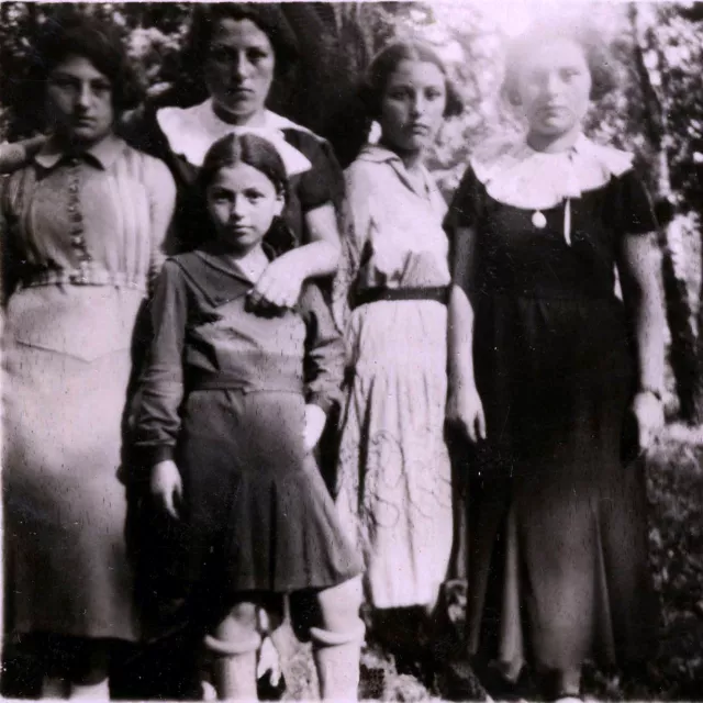 This is a photograph of the Königsberg sisters, but my mother, Lola, isn't among them. She was the oldest of them all, and so basically took care of them. I unfortunately don't know where and when this photo was taken. From left to right, they are: Dina, Bracha in front, Esther in the back, Toshka and Lea.