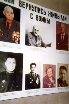 This photograph was taken at the Velizh museum. It shows the photographs of the war participants. Above the photographs the following text is written: ‘These people came back from front lines alive.’ The photo of my husband is first from left in the second row. My husband spent his childhood and youth in Velizh.