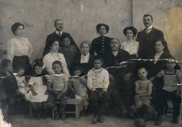 These are the Pinkases in 1916-1917. The ones seated in the middle are grandpa Sason and grandma Bouka (a white-haired woman sitting on his left and wearing a brooch). The one standing between them is my mother Rashel. She’s wearing a dark dress with buttons. The rest are the relatives (wheat-traders) and their children (my cousins). My mother was not married yet. She was the youngest in the family.