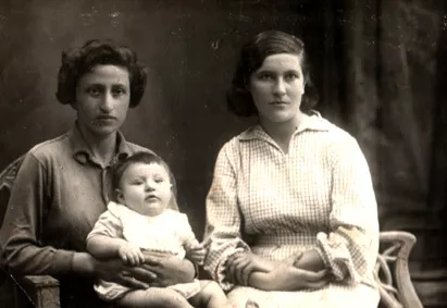 Me, Polina Levina (on the left), holding my daughter Valeria Sokolova, nee Levina. My husband's younger sister Lubov Miach is sitting on the right. This photo was taken in Krivoy Rog in 1940.