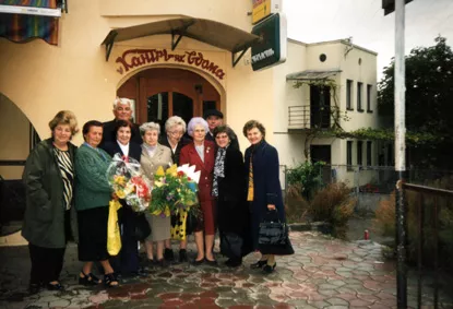 Teachers of the school where I worked until I retired at the annual meeting of teachers and their former pupils. Me, Polina Levina - 4th on the left. This photo was taken in Uzhhorod in 2001.