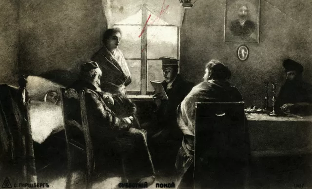 I was learning to write then and scribbled the word ‘Mama’. This post-card is called Saturday Rest, it depicts the Sabbath morning of a Jewish family.