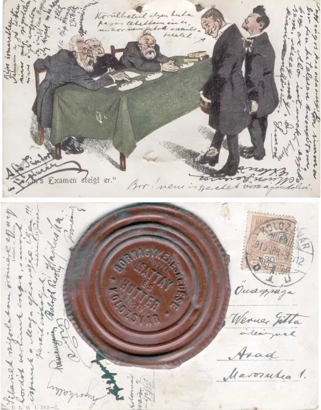 This funny postcard represents two students, who are sitting for an exam. My father, Sandor Popper sent it to my mother, before they got married, in 1914.