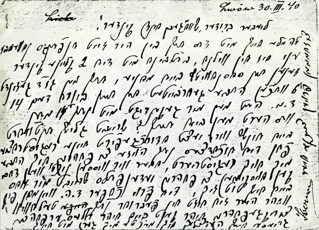 At the beginning of the Nazi occupation we ran away with my brother and Father to Lwow. Father is writing in Yiddish to his brother, Jakub, in Palestine. There's a stamp: 'Palestine, pass by censor' and next to it: 'USSR.'